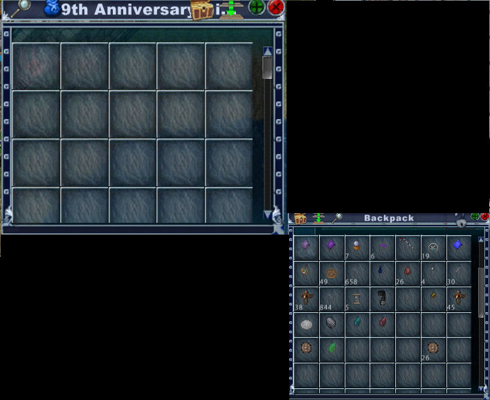 Scale mode allows you to individually scale most game windows. Drag the icon into a hot bar slot and click on it to toggle the mode on. Click on the top of the window you wish to change. Pictured below, a default backpack size with a backpack enlarged using scale mode and a default hot bar with a set of hot bars scaled down using the mode (click on the images to see them at full size). Click on the icon in the hot bar to toggle the mode off when you are finished.